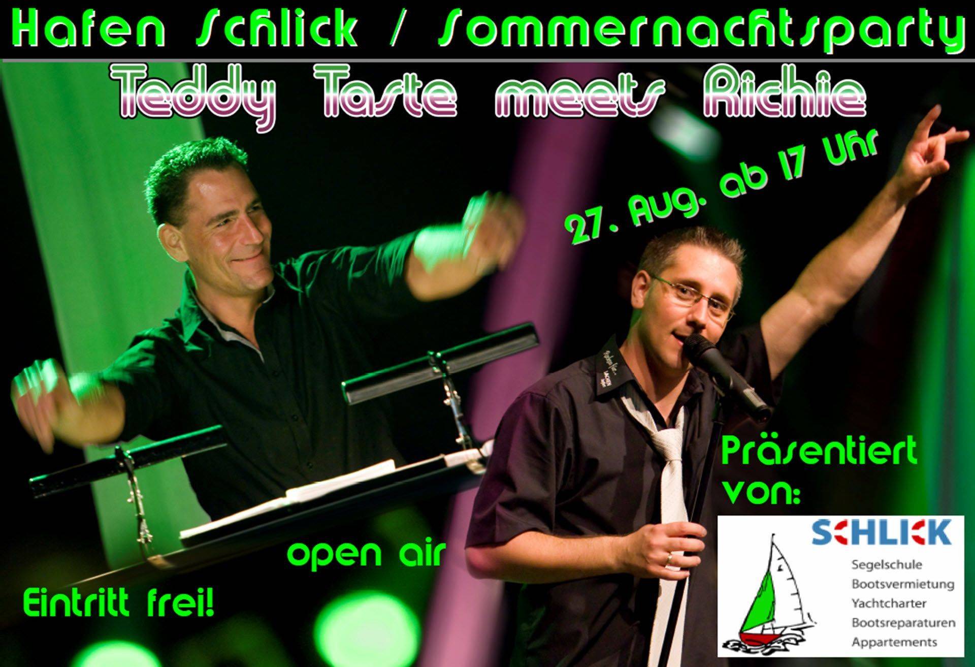 Wir genießen den Sommer und feiern das Leben – am 27. August 2022 ab 17:00 Uhr auf unserer Sommernachtsparty! Seid dabei und erlebt einen unvergesslichen Abend. Das Duo „Teddy Taste meets Richie“ unterstützt uns mit den besten Hits der letzten 50 Jahre aus Rock, Pop und Schlager. Auf ihrer „Ohrwurm-Kur-Tour 2022“ machen sie einen Abstecher bei uns und heizen uns ordentlich ein.